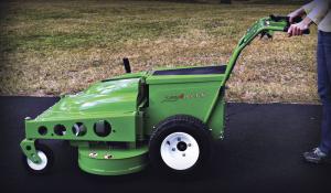 When under power, fingertip, variable speed control lets the operator go from barely moving to 5 mph in forward and 2 1/2 mph in reverse. The residential mower is priced at $2,795.