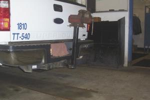 “The vise bolts onto a square steel plate that bolts onto a vertical length of 2-in. sq. tubing. A round tow hook off a Volvo semi truck is welded to the bottom of the tubing and pins onto the pickup’s receiver hitch. Whenever we need to use the vise on a job, we just bolt it onto the plate and go. The only limitation is that with the vise mounted we can’t open the tailgate. However, it takes less than 5 min. to remove the 3 bolts from the plate.”