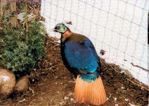 The Seifers have had the best luck keeping them in pairs in separate pens, sometimes with a pair of doves. With their sharp, downward beaks, Impeyans are notorious diggers. So the Seifers have wire on the bottom of the pens and protect any vegetation they want to keep with wire fencing.
