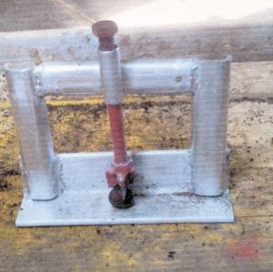 He dumps the cracked walnuts onto a homemade 4 by 5-ft. sorting table to be hand sorted. The de-hulled nuts go down one hole into a pail and the hulls go into another hole. When the nuts are dry, he cracks them using a homemade cracker. It consists of a metal frame with a 10-in. long bolt that has a 4-bladed knife screwed onto the bottom of it. To crack, Palmby sets the nut under the knife and then hits the top of the bolt with a hammer.