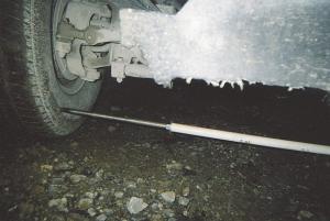 To use the tool, Cooper measures the distance between the 2 front tires before he removes the tie rod end, then threads the rod into the pipe. Then he places the pipe end of the tool against one tire and the threaded rod against the other.