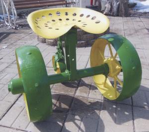 The 3-wheeled, all-steel chair rides on steel wheels and is painted Deere green and yellow.