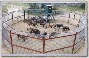 The Wireless Trap system can capture one hog or several members of a family group. The company recommends a 6-ft. tall by 30-ft. dia. modular steel gate enclosure for the trap. Panels are pinned together and the headgate opening is equipped with an electronic latch. An automatic feeder is placed inside to entice animals to enter. A motion-activated remote camera is installed at the center of the trap to photograph animals when they enter and send the image to the owner. The camera can also be triggered randomly from a cell phone or a computer.