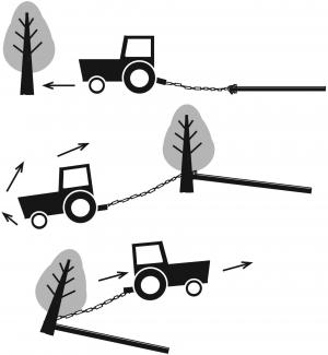The idea is to drag a 20 to 25-ft. heavy pole behind a tractor with a 20-ft. log chain. Drive around the tree you want to pull and “trap” the tree trunk right where the chain meets the pole by turning the tractor around. It’ll yank the tree right out.