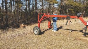 The boom also hinges to a crossbar on the angle iron framework of the arch. Made from 2-in. dia., heavy wall, steel tubing with an angle iron cross frame near the bottom, it stands 22 ft. tall when straight in the air. The large winch cable runs through a pulley on the arch to a pulley on the end of the boom to provide lift. The small winch attaches to the cross frame to tilt the boom. Support chains from the boom frame slip onto hooks on the arch to carry the load once the boom is in position.
