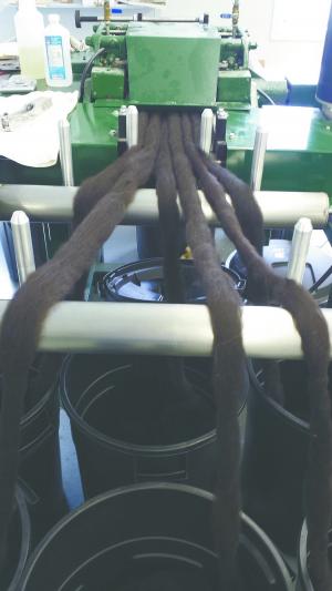 For those customers who want their fiber processed even further, it can be pindrafted. Here, sharp metal combs convert roving into more parallel and longer fibers called semi-worsted fibers.