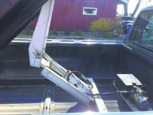 “I bought a small grain cart, removed the wagon running gear, and cut off the front end of the cart so it would fit in the back of my pickup,” says Flaherty. “ I attached it to a home-built hoist mounted in the bed of the truck. I bought a used cylinder that’s powered by an electric hydraulic pump from Tractor Supply Company. It simply wires to the trucks’ battery and to a switch in the cab.