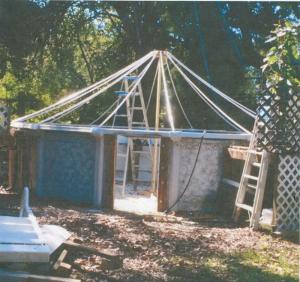 To make a center pole, he cut a 12-in. dia. circle out of plywood and mounted it on top of a 12-ft. long 2 by 4. Then he cut fourteen 6-in. pieces of 3/4-in. pvc and spaced them evenly around the perimeter of the plywood disc, screwing them down so they stick straight out. Then he glued a 45 degree pvc connector to each pipe and inserted 10-ft. pieces of pipe that run to the sides of the pool. Then he cut another circle of plywood and fastened it over the top of the first on the center pole to hold the pvc pipes tightly.