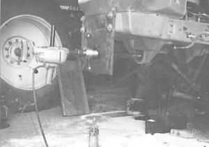 Gamble removes the tie rod and bolts the tool in place, then uses a 1/2-in. drill with a 1 1/4-in. bit to drill through the bushing and into the hole. Once it's drilled out, he presses a tapered bushing into the hole and reinserts the tie rod.