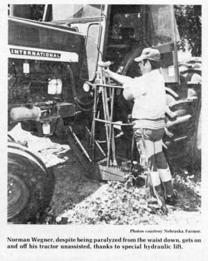But not for long. Using a John Deere tractor equipped with a hand clutch, he hoisted himself out of his wheel chair and onto the tractor seat and once again assumed the operation of his farming enterprise.