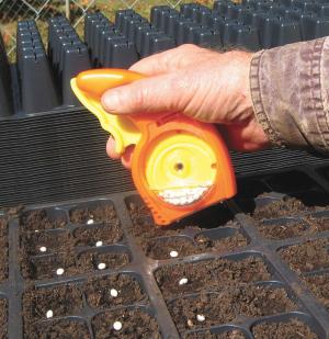 The SowEZ handheld seeder uses field proven seed disc technology for the precision planting of pelleted and some non-pelleted seeds. Trigger actuation allows for fast and accurate sowing. The seed disc has four seed cups that accommodate all three available sizes of pelleted seeds. An additional seed cup is designed for Brassicas such as broccoli and kale. The seeder works on some other roundish seeds as well. Seed cups are changed by turning a knob on the back of the seeder. No tools needed.