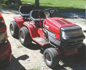 “He had an old MTD that no longer worked,” explains Carter. “He cut it off just ahead of the driver’s seat and welded a steel plate between the 2 frames to make a 2-seat, 6-wheel garden tractor.”