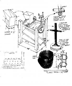 He designed a frame 28 by 29 in. in size with a height of about 30 in. It has an apple hopper to the left and a press on the right. A slanted tray with 2-in. rails mounted about 10 to 12 in. off the ground holds the pulp baskets. It has room for one being filled and a second one being pressed. A pipe in the lower end drains pressed cider into containers.