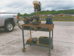 The cart carries a vise, drill press, and grinder. He moves it with a metal pull handle attached to one end.