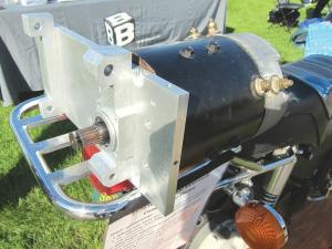 The 3 1/2 hp., 48-volt, 3,600 rpm golf cart motor is located directly in front of the rear wheel. An adapter connects the motor to the motorcycle’s driveshaft. Two stacks of batteries fill in the space where the engine used to be. They consist of 16 100 amp-hour GBS lithium batteries purchased at an online golf cart shop and are enclosed in a sheet metal frame. An on-board charger is mounted in the main battery box.