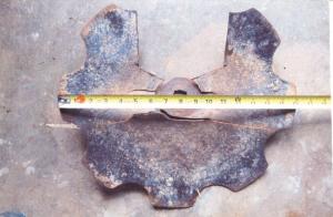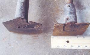 He used a disc grinder to cut a 5 by 4-in. section out of a 16-in. dia. disk coulter to serve as the hoe blade. He also cut a 4-in. long section out of a 1 1/2-in. dia. metal pipe and welded it to the blade. Then he drilled 2 holes in the pipe, inserted a 30-in. long wooden handle, and screwed it on. A side grinder was used to sharpen the blade.