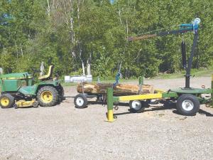 Newman pulls the equipment to the woods and cuts logs into 8 to 9-ft. lengths, then uses the crane to load them onto the wagon. Once 4 or 5 logs are loaded on the wagon, he uses the crane at home to unload the logs onto a big home-built steel sawhorse, where he cuts the logs into 16-in. lengths. He rolls the pieces onto a nearby wood splitter, with his wife running the controls.