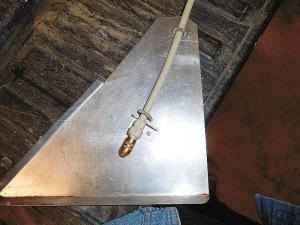 He used an old cookie sheet because it was fairly stiff yet lightweight. As shown in the photo, he cut off an angled piece and used U-bolts to attach it to a spray wand on a 3-gal. garden sprayer.