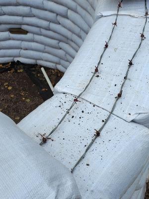 With the help of family and friends, Rovig created a raised tamped gravel pad and then built up walls using bags filled with dirt. She notes that earthbag construction is used by some people to build homes (www.earthbagbuilding.com). Sandbags are filled with damp soil that contains 5 to 30 percent clay and then stacked like bricks. Two rows of 4-pronged barbed wire placed between the layers help stop the bags from slipping apart. The bags are firmly tamped down so when they dry they are rock-hard and fit tightly together, similar to adobe.