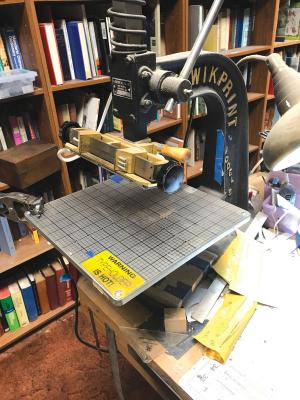 He learned book restoration by visiting other book repairmen and taking classes. Robards worked in commercial printing for 25 years before “retiring” and opening his used book store and Robards Book Binding & Repair. He located older equipment that he needs for restoration and has collected dozens of fonts and decorations used for embossing.