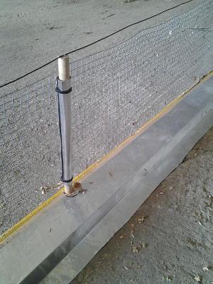 The fence consists of a 1-ft. wide strip of hardware cloth fastened to 1-ft. tall wooden dowels inserted into a base made from 2 by 4’s. Metal flashing angled outward, covers the base. A fence charger, which runs off a 120-volt outlet in the machine shed, charges the fence. The hardware cloth connects to the charger’s positive wire, and the flashing connects to the negative wire. The mouse climbs up the flashing, and as soon as it contacts the hardware cloth it gets a big jolt of electricity and dies.
