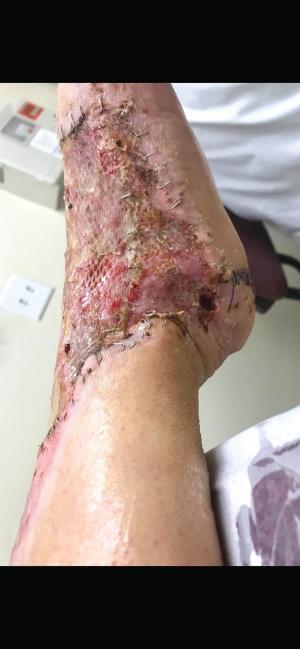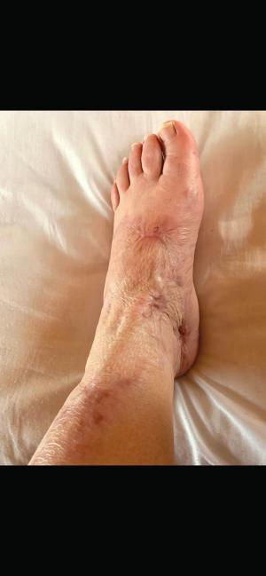 Liz was sent home after day 39 with instructions to rewrap her foot daily while using a prescription wound product. She wanted a more natural product and chose Miracle Heel, a wound product for horses. It was a Bees Wax & Lanolin base that contained a natural antiseptic and healing agent called propolis and a healing extract from the comfrey plant. It was only necessary to change the bandage every 2 days instead of daily as requested by the doctor.