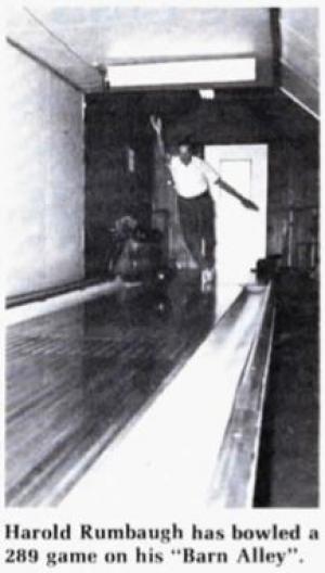 Harold Rumbaugh converted an old livestock barn on his farm into a one-lane bowling alley for his own recreation and that of his family and friends.