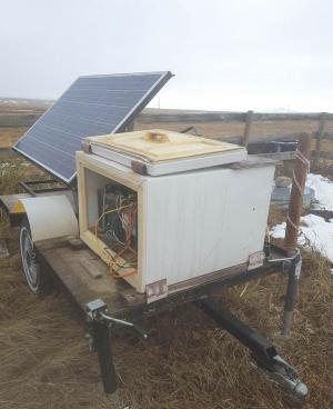 “We made the trailer using the rear wheels from an old Chrysler K-car,” says Erdman. “We mounted the 250-watt solar panel and an old chest freezer on the deck of the trailer. The freezer lays on its side and holds four deep-charge, 6-volt batteries and an AC inverter.”