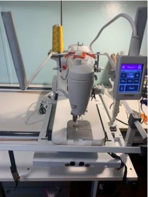 Pricing for a simple frame and carriage starts at around $600, while more intricate frames and long-arm machines with programable software can run $25,000 or more. “While I would love a more expensive set-up, I opted to purchase a Grace Co. frame and use my own sewing machine on the carriage,” she says. “The carriage had handles that came out under the frame about 18 in. at hip height. I decided I wanted shoulder-height handlebars instead. Aftermarket handles would cost about $300.”