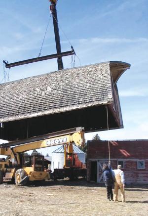 Rumsey and his six sons launched a plan to move the barn to their father’s farm. Their initial plan was to lift the complete barn onto a moving skid and haul it the 3 miles to Rumsey’s farm. That idea was scuttled when they learned that reinforcing it for the move was too difficult. Instead, they hired a crane service to carefully lift the radius roof from the side walls and set it onto a supporting frame. The base walls were then jacked up and placed on large steel beams by a local house mover.