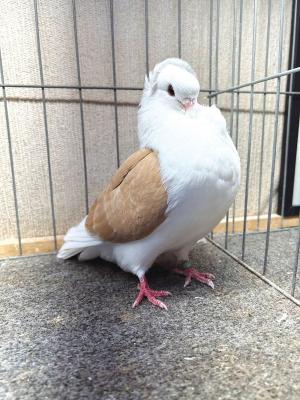 He keeps eight breeder pairs comfortable in a meticulously clean pigeon loft and pays attention to the birds’ markings to follow the breed’s strict standards. The body, head, and neck should be white, and the wing shield should be colored. When the wings are open, the furthest flight feathers should be white.