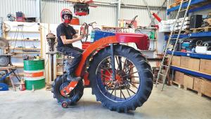 After seeing a similar attempt online, Paton grew interested in building a vintage bicycle known as a penny farthing. “I watched a video of a man pedaling a large penny farthing with a tractor tire up front and two smaller wheels at the back. I figured I could do better with a front wheel steer and an engine in the rear.” When further research showed that most designs used a moped engine, he decided to build one with tractor parts. “I called it the PennyFarming,” he says. “Think tractor up top and motorcycle down below. One of my followers online thought up the name, and it stuck.”