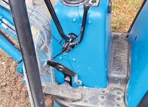 “The crank rods were merely threaded rod with tie rod ends,” says Gunn. “I connected them to the OEM hand levers. It’s really handy when you have to lift the tracks to turn or travel a distance. You can just sit back and let your toes steer instead of hunching over the controls.”