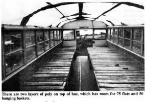 Smith got the buses - minus the engines - for nothing from a local bus company. He sold the power steering units and rear ends and then removed the seats and cut off the roof. He left three supports across the top where the roof was riveted onto the bus and then put a double layer of clear polyethylene over the top. A small electric fan is used to blow air into the space between the two layers. Wooden benches on each side of the bus are used to hold plants, and a pair of steel rods running lengthwise at the top of the bus are used for hanging baskets.