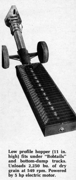 The hopper is low enough (11 in.) to fit under Bobtails or bottom-dump trucks. With a 5 hp electric motor mounted at the "output" end, weight of the unit is evenly distributed over the 15 in. standard automobile tires for easy, one-man handling. The unit is equipped with in. flighting in the inclined section, which is coupled via a U-joint to 7 in. dia. flighting in the hopper bottom.