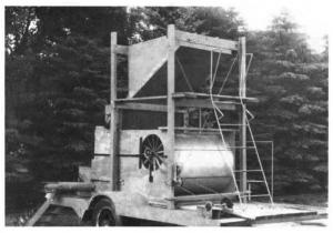 The trailer-mounted cleaner uses air instead of screens to clean grain. It consists of two large home-built fans housed inside a large metal drum. Freshly harvested grain is augered into a slant-bottom hopper on top (salvaged from an old combine). It feeds grain into a hopper just below it. A belt-driven square steel shaft mounts at the bottom point of the lower hopper. As it rotates, it allows a thin "sheet" of grain to fall straight down. Lighter material such as weed seeds, chaff, and dust is blown out onto the ground at the end of the trailer while heavier, clean grain falls into another hopper where it's augered out into a bin.