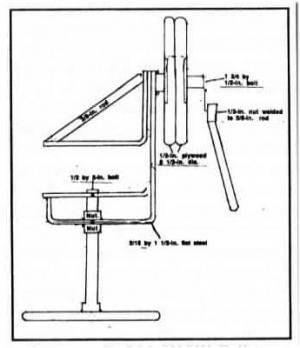 He made the blade holder out of 1 1/2-in. wide flat steel with a spindle that holds the blade, sandwiched between two 5 1/2 in. dia. 1/2-in. plywood circles. A hand tightened hold-down bolt holds the blade tight and can be quickly loosened to rotate the blade.