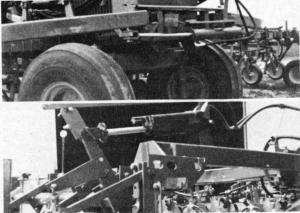 Now, when the neighbor goes to the field, he gets out of the tractor, removes the transport bars which hold the cultivator in front of the tractor for road travel, gets back into the tractor, then pulls the hydraulic valve while he drives forward slowly. When the cylinder reaches the end of its stroke, he gets out of the tractor, puts in the latching pins, and then begins cultivating.