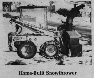 Home-Built Snowthrower MISCELLANEOUS EQUIPMENT Miscellaneous 10-2-6 Reinhardt Preheim, Mountain Lake, Minn., built his own "snowthrower" using a Melroe skid steer loader that he's had for more than 20 years. He added his own homemade snowthrower, which is powered by a 26-hp., 4-cyl Wisconsin gas engine mounted on the snowthrower frame.