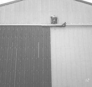 The alley scraper power unit consists of a 1/2-hp electric motor, cable, and a pair of pulleys. Adam mounted the motor above the door, centered at the top of the track, and bolted a 2 1/2-ft. long angle iron bracket to each end of the door. He welded a steel upright at the end of each bracket where he mounted the pulleys. The motor pulls the cable back and forth around the pulleys to open or close the door and is activated by a reversible switch.