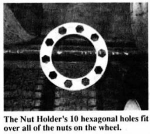 The Nut Holder is a 6-lb. steel disc measuring 14 in. in dia. and 3/8-in. thick. In the center of the tool is a 10 1/4-in. round hole surrounded by 10 hexagonal holes which fit over all of the nuts on the wheel. The tool is designed for large semi-trucks with wheels held on by two sets of nuts. When you try to remove the outside wheel, sometimes the outer and inner cap nuts both come off with the outside wheel. The Nut Holder simply holds the outside nuts in place while you turn the inner nuts outward.