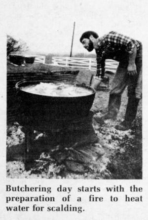Butchering day starts early with preparation of a fire for scalding and for cooking down lard, and lots of activity in the house preparing food for the butchering crew. By the end of a typical "butchering day," about six hogs will have been processed.
