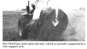 Hydraulic Spike Unwraps Big Bales HAY & FORAGE HARVESTING Bale Handling (5) 5-5-34 Big bale handling and feeding devices keep getting better and better, and the new Apache "Hay Chief" is no exception. It's a hydraulic bale spike with something extra ù a paddle type side fork that peels off the hay, regardless of how tangled or tightly packed, placing it right where it's needed.