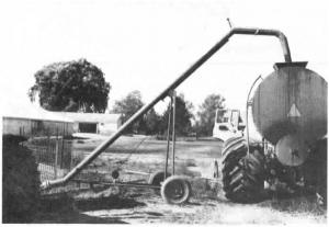 "I've used it for the past five years to load hundreds of thousands of gallons of manure without any trouble," says Miller, who uses the fill pipe on his chicken farm and also does some custom work. "I can raise or lower it in seconds and it's easy to trans-port. I disconnect the rubber pipe and throw it over the 3-pt. mounted pump. I pull the fill pipe behind the spreader truck - an old GM 9500 with a Husky tank mounted on it. The unloading end of the pipe hangs out quite a ways so I can drive the truck right under it rather than having to back in."