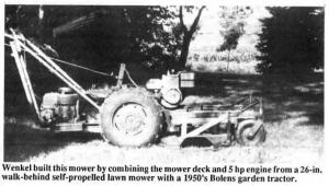 "It seemed like I had to make a choice between buying half the mower again in parts or an entire new mower," says Wenkel. "Combining the mower and garden tractor turned out to be a less expensive solution. Although a bit long and heavy, the mower is well balanced and handles easily. I can adjust ground speed according to mowing conditions by varying the throttle settings on the two engines. For a total investment of $12 for the mower belt, it's hard to beat."