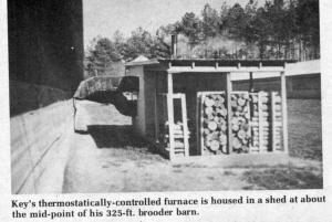 What Key has designed is thermostatically-controlled wood furnace housed in a shed not more than a few feet away from the 325-ft long barn. Air is ducted into the barn by conventional heating ducts to large center duct that carries heat to either end of the long barn, keeping temperatures from 60?to 90?, depending on the age of birds.