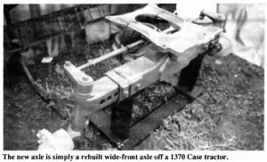 The new axle is simply a rebuilt wide-front axle off a 1370 Case tractor. The Case axle is fitted with the Deere mounting saddle and center steering arm so it installs with no modification to the tractor itself. One problem with the Deere axle, says Wagaman, is that the axle housing is cast iron. The Case axle housing is made of steel.