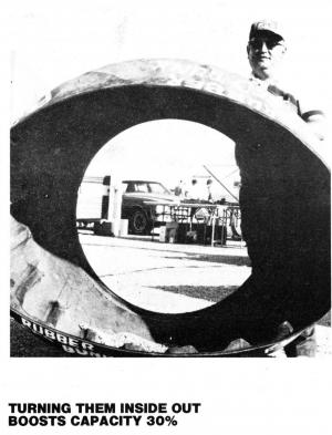 He adds that turning tires inside out boosts their capacity 30%. The machine not only turns the tire completely inside out, but also cuts off the top bead to give the turned-around tire more feed or grain holding capacity.