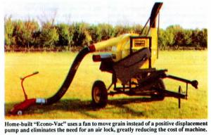 "I spent only $3,500 to build it, not counting my labor. The cheapest grain vac on the market with comparable capacity sells for $9,000," says Orosz. "The problem with conventional grain vacs is that they use high tolerance components such as positive displacement pumps which can quickly wear out due to grain dust, dirt and gravel. My Econo-Vac works great for cleaning up grain piles on the ground because stones and dirt go right through it with little problem.