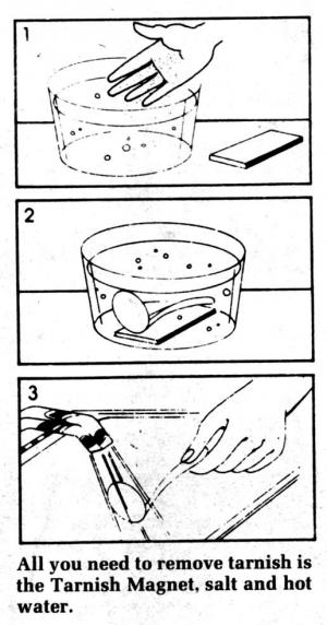 "Replaces a whole shelf of dangerous chemicals and messy paste cleaners and is 100% safe," says the manufacturer of the Tarnish Magnet, an automatic tarnish remover that doesn't require any scrubbing or rubbing.